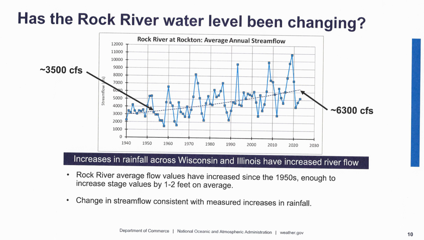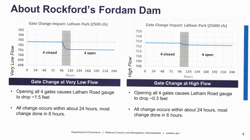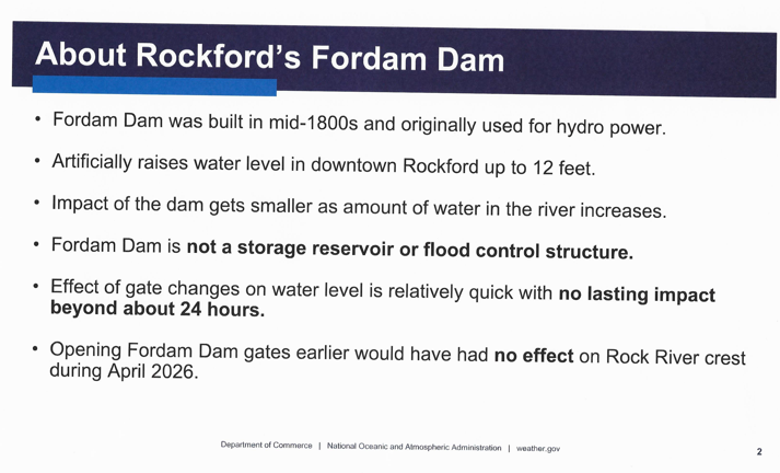Sheriff Gary Caruana and his team attended the meeting and presented info on the following images. The following stresses that the Fordam Dam is not a storage reservoir or flood control structure. They further stated that recent computer model analysis performed by the National Oceanic and Atmospheric Administration (NOAA) (weather.gov) that opening the dam gates earlier would have no effect on the Rock River crest during April 2026.
