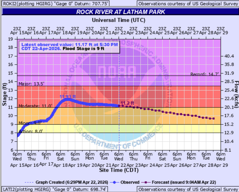 Below is the current gage at 4/22/26 at 6:49 PM CST. The river is receding pending no further rain fall will occur.